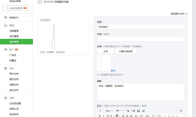 登陆微信公众后台,点击左侧菜单“素材管理”-“新建单条图文消息”。